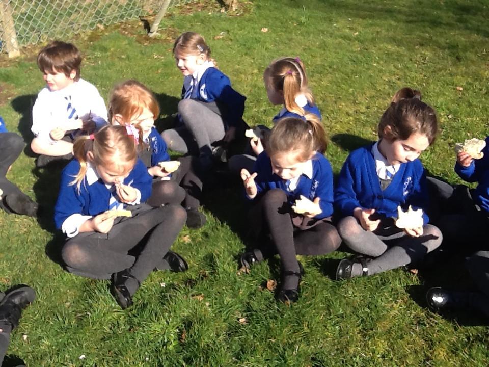 It was such lovely weather this afternoon, that we decided to have a picnic outside. Mrs Griffiths cut the loaf into slices, and we enjoyed eating a piece of homemade bread and butter outside. We then had sometime on the adventure playground. We are looking forward to sharing a bread roll with our families as we are all bringing one home this afternoon!