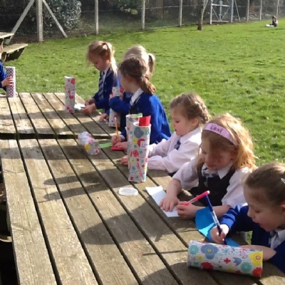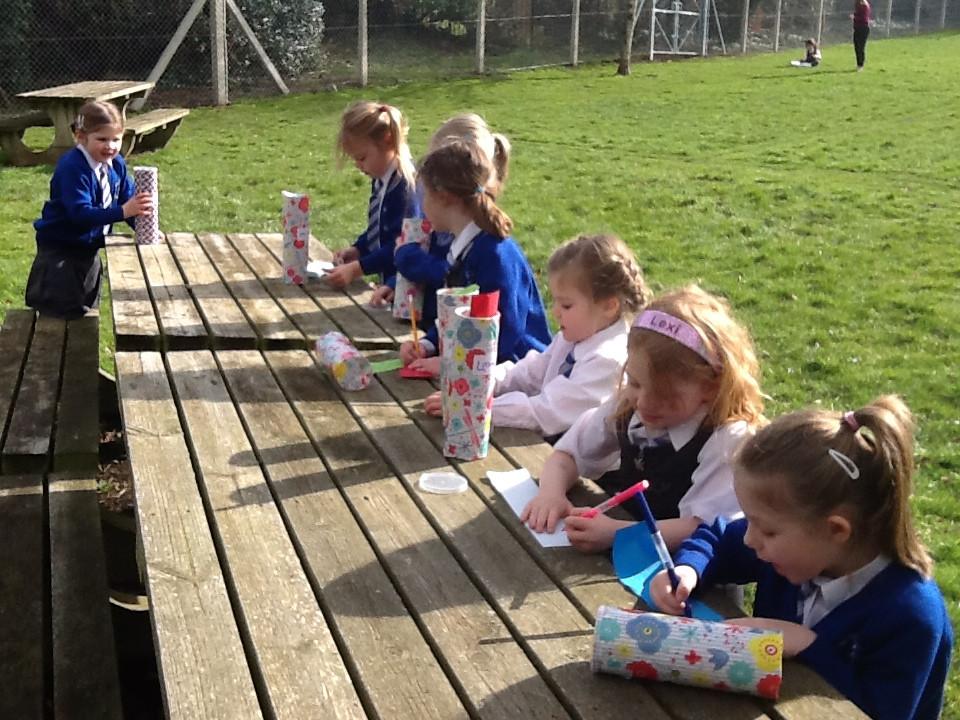 Over the last few weeks, children in Ladybirds Class have been bringing in empty crisp tubes .... and today, they found out why! Every child chose some wrapping paper and decorated their pot. After writing their name on a label, they then waited to see what it was for. Everyone was very excited to be given some colourful paper, new pencils and bright pens. We are really hoping our new Jotter Pods will help us with our independent writing. We can take them anywhere and use them to write words, sentences and ideas. For example, we can take them into out outside area when we are exploring in the sand, or even jot down some ideas whilst in the role-play area.