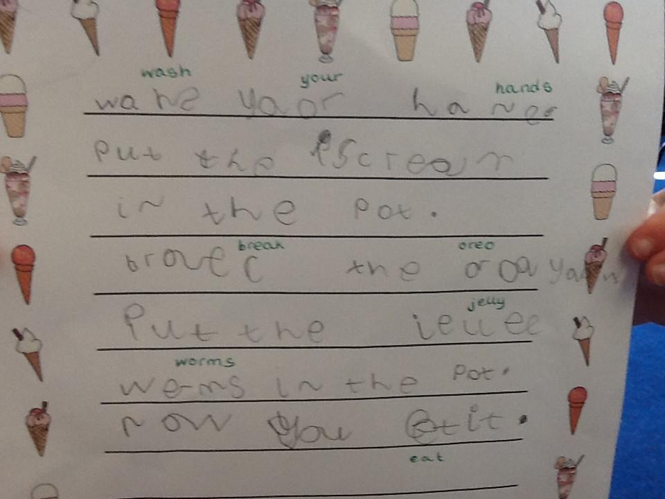 This week in Ladybirds Class we have been reading 'Superworm' by Julia Donaldson. This afternoon the children wrote their own instructions to explain how to make a worm sundae! After the instructions were written, we had a lot of fun making (and eating) our delicious snack!