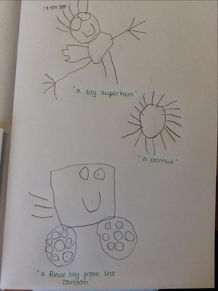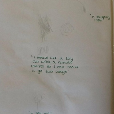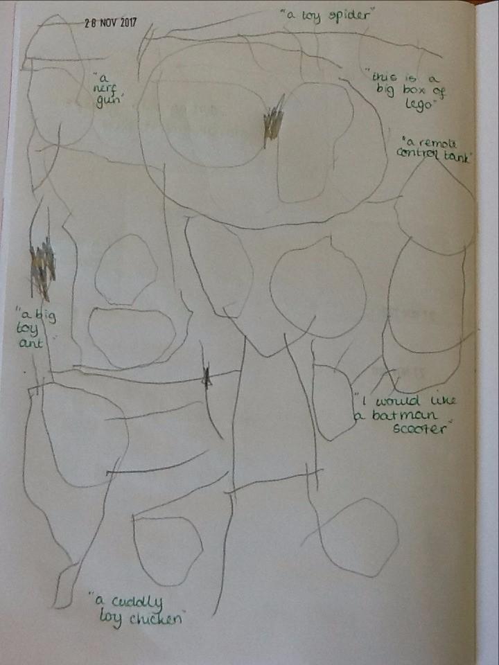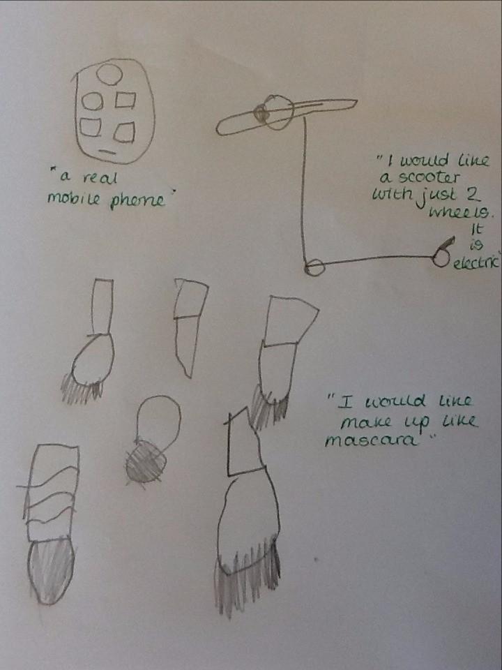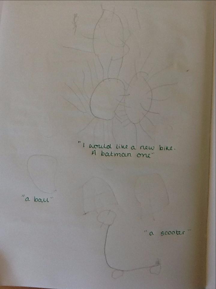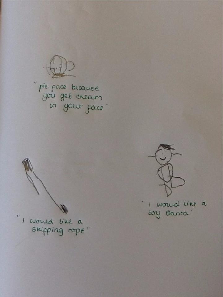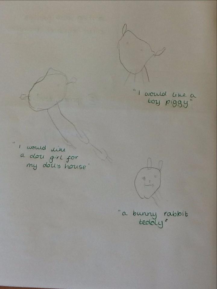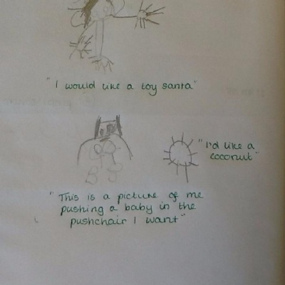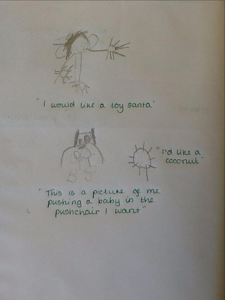 Mrs Robinson brought a letter into our classroom this morning ... and it looked a bit unusual! It was very large, and was covered in gold. When we opened it lots of glitter came out with a special letter. The letter was from Father Christmas! He has asked us to write to him to tell him what we would like for Christmas. Today we have started to think of some ideas and over the next few days we will write our letters. When we have finished, we are going to put the letters in an envelope and walk down the street to post them. Here are our drawings of what we would like for Christmas.